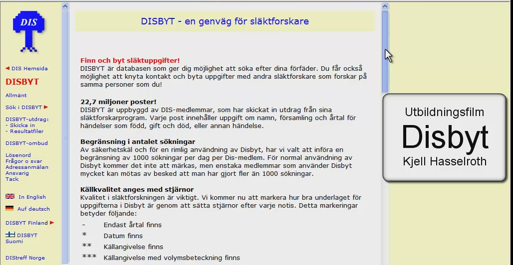 DISBYT är databasen som ger dig möjlighet att söka efter dina förfäder. Du får också möjlighet att knyta kontakt och byta uppgifter med andra släktforskare som forskar på samma personer som du! Databasen innehåller nu födelsenotiser för 67% av alla som levt i Sverige mellan 1700 och 1900. Så sannolikheten för "träff" med andra forskare och kanske nya släktingar ökar stadigt hela tiden