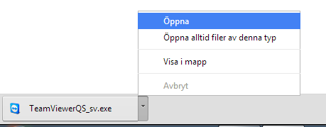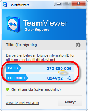 Bekräfta att du vill köra. TeamviewerQS. Klicka Kör! Teamviewer kommer inte att installera något på din dator. När uppkopplingen avslutas finns inga spår i datorn. |