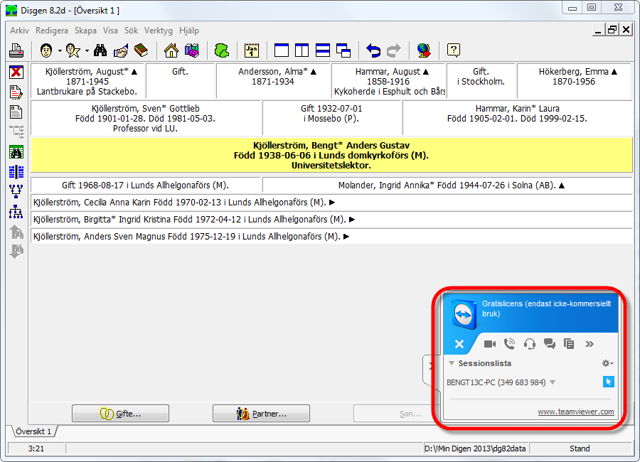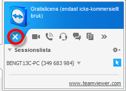 Han loggar in på din dator och nu ser ni båda samma bild på skärmen . Rutan i nedre högra hörnet bekräftar att du är inloggad med Teamviewer. |