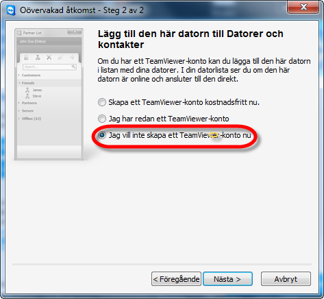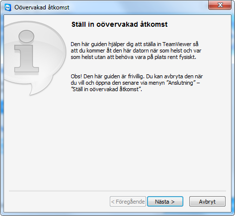 Bekräft att du vill köra oövervakad åtkomst med Teamviewer på din dator. Klicka Nästa. |