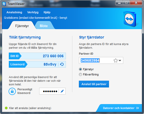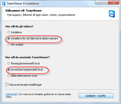 Välj att du vill installera TeamViewer för att fjärrstyra datorn senare och markera att du vill använda programmet för personligt bruk. Klicka Godkänn!