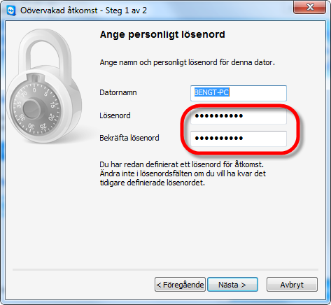 Här anger du ett personligt lösenord för din datorhjälp och upprepa det. Anteckna lösenordet så att du kommer ihåg det! Klicka Nästa. |