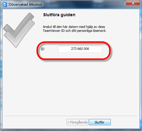 Här får du reda på din dators ID-nummer. Anteckna detta tillsammans med lösenoret! Klicka Slutför. |