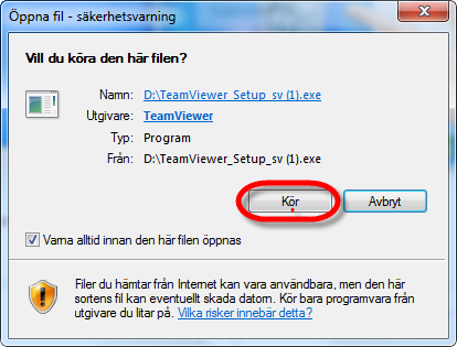 Bekräfta att du vill köra Teamviewer. Klicka Kör! Teamviewer installerar fullversionen på din dator. |