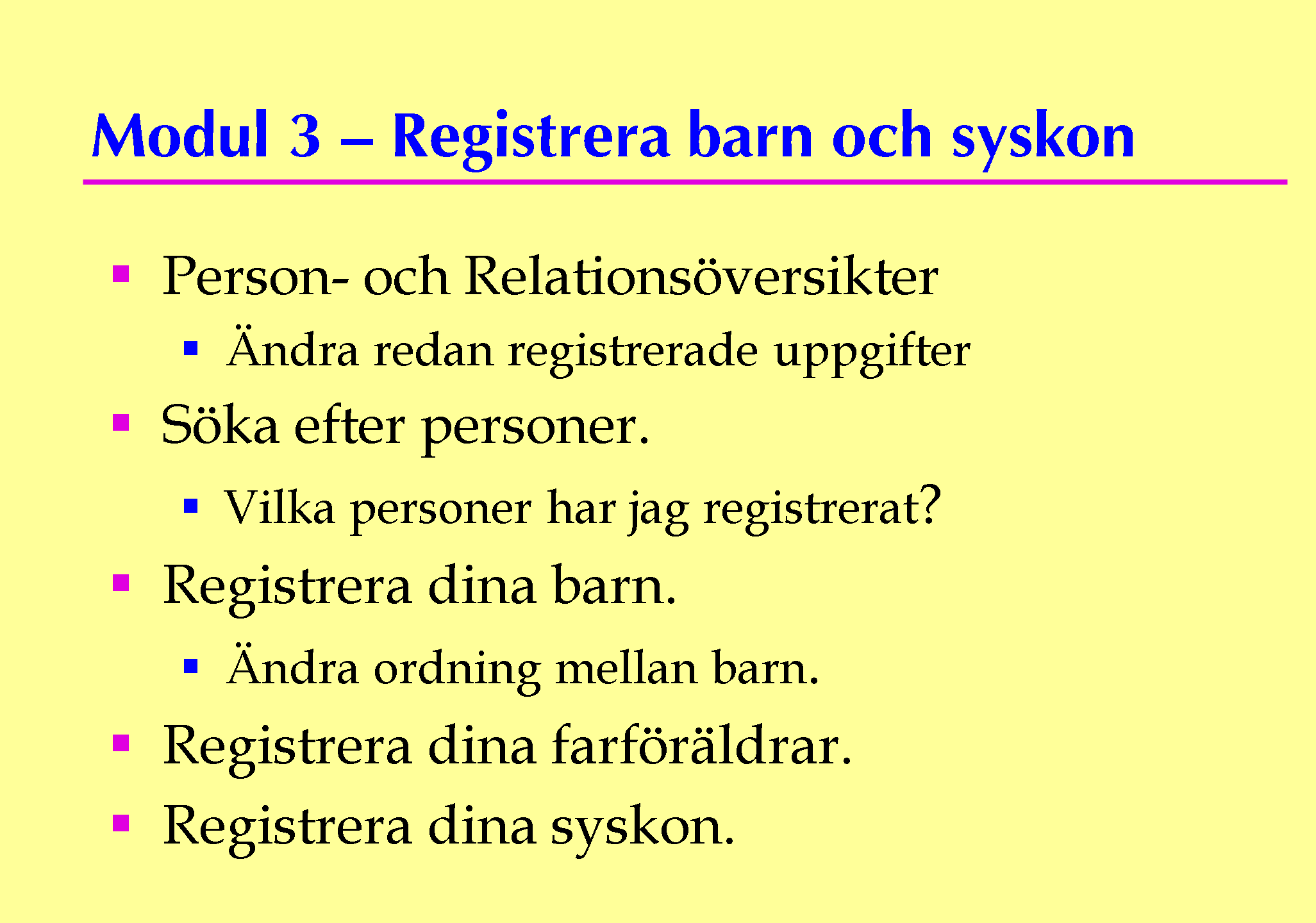Med hjälp av handledning, presentationer och video ska du nu på egen hand lösa följande uppgifter:- Registrera dina barn