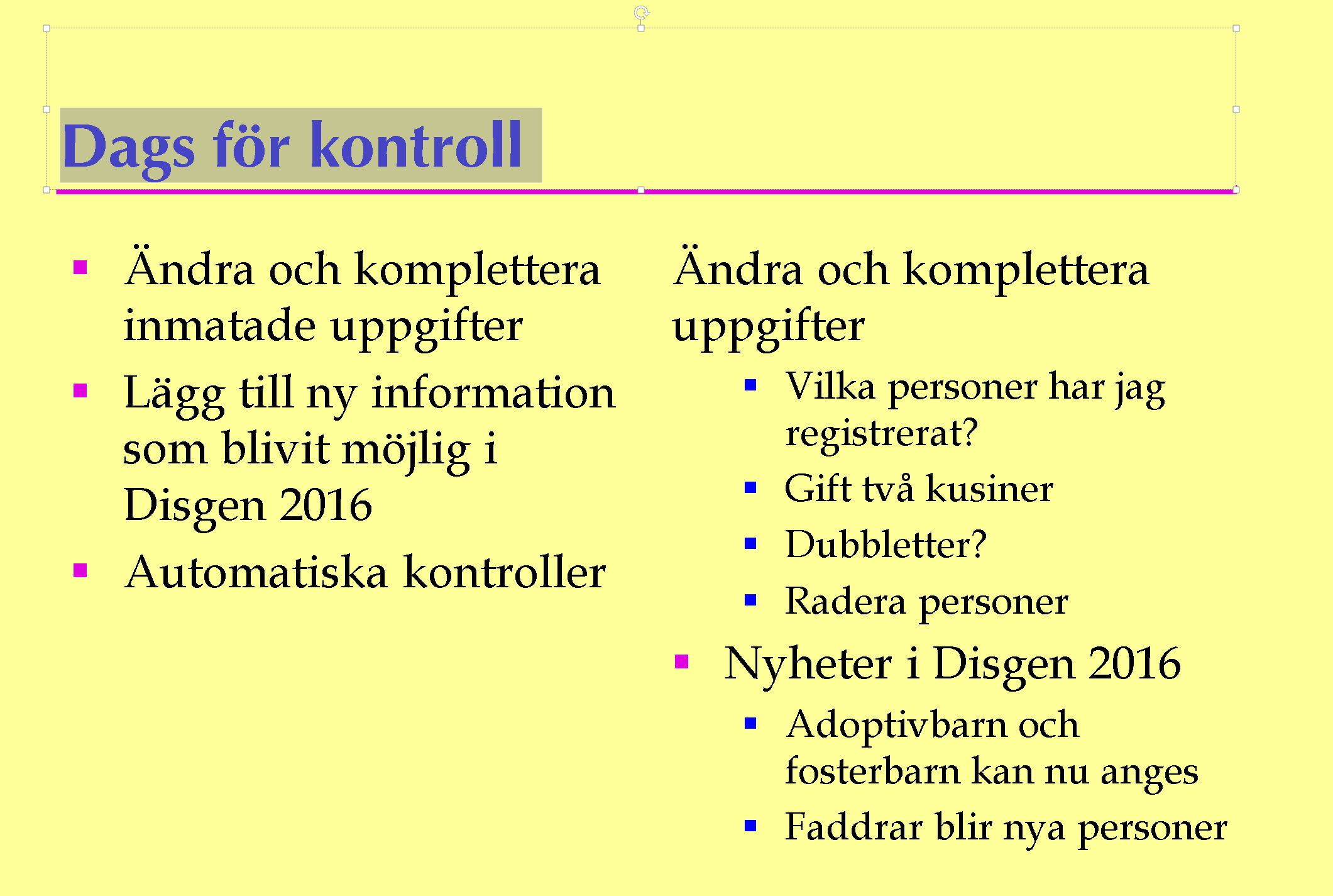 - Har du tidigare matat in faddrar? De är nu könlösa. Registrera dem som riktiga personer. Är de släkt? Kolla att de inte blivit dubbletter.