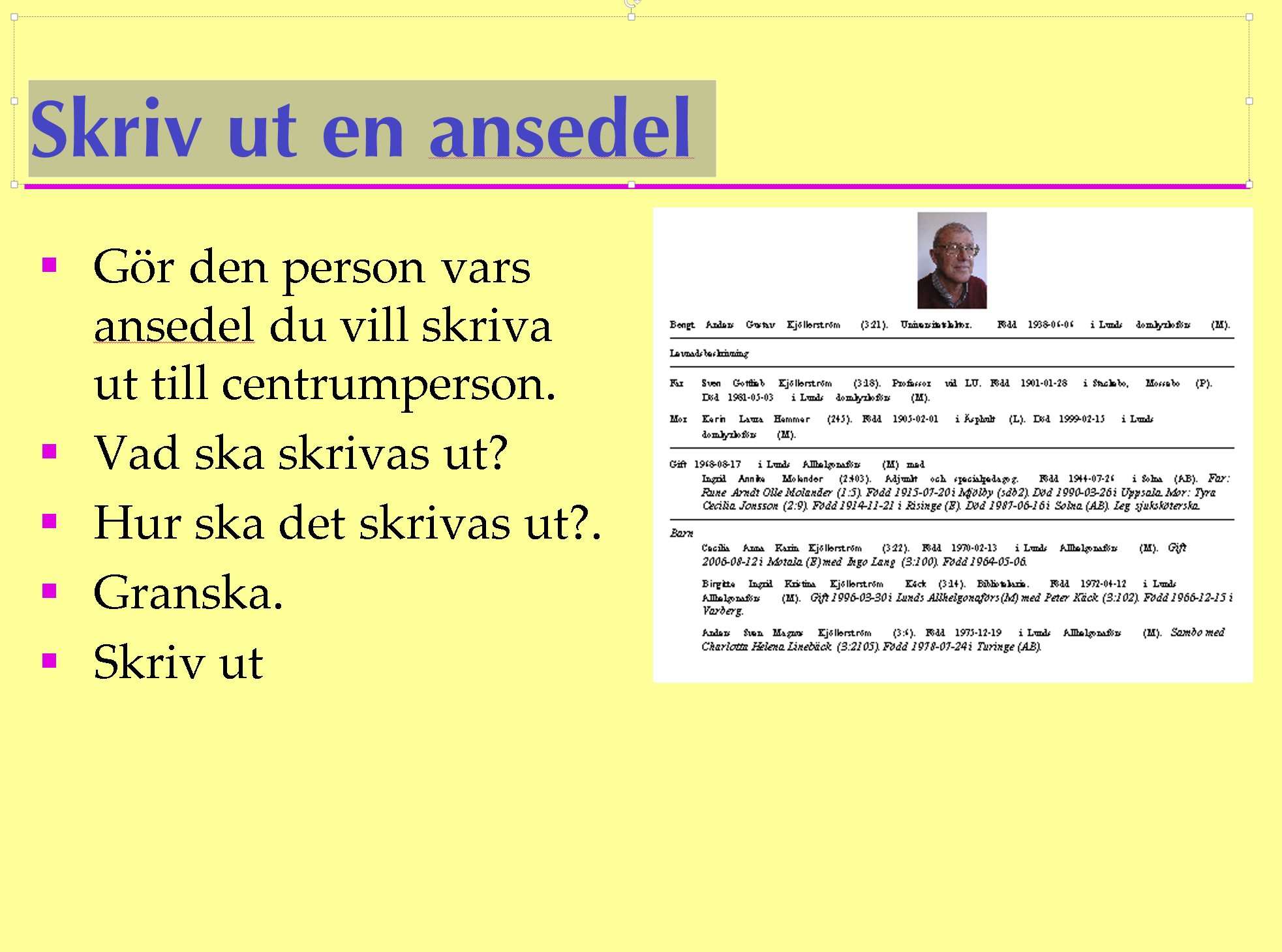 Med hjälp av handledning, presentationer och video ska du nu på egen hand lösa följande uppgifter:- Skriv ut en ansedel